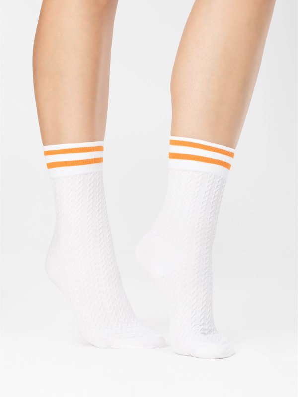 Player er nylonstrømper der af mange vil anses for at være en usædvanlig kombination. Med nylonstrømperne Player får du kombinationen af sarte boho-fletninger med en udtryksfuld og sporty rib i livlige farver. Vælg mellem orange eller koboltblå striber, som skiller sig smukt ud og står flot i kontrast til den subtile grundfarve. Tag godt imod Player og vis at du også har modet til at spille med. :-) Produceret af garn af højeste kvalitet fra førende europæiske garnproducenter. Europæisk designet, europæisk produktsikkerhed, europæisk kvalitet, europæisk fremstillet.