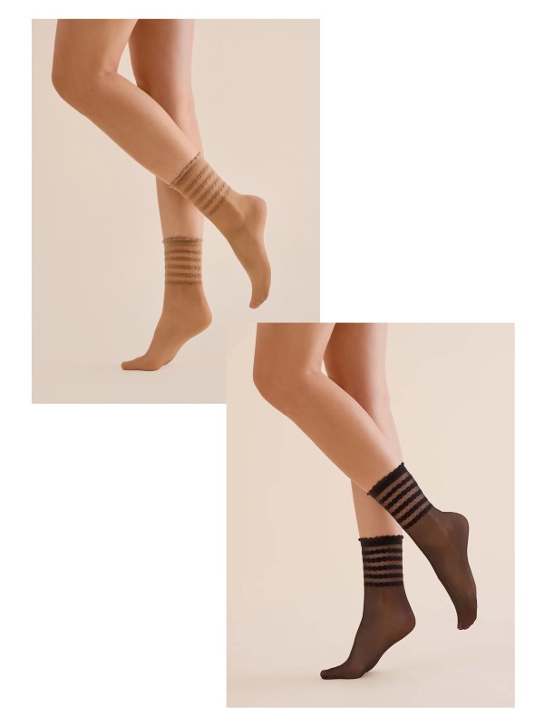 Gabriellas Lora nylonstrømper appellerer til de, der stræber efter det udtryksfulde modetilbehør. Strømperne pryder dine ben med et prikmønster omkring anklen afsluttet i en bølgeformet rib / manchet. Modellen er produceret uden en markeret hæl- og tå-del, hvilket giver dig mulighed for at kombinere disse nylonstrømper med forskellige sko. Usynlig tå-forstærkning for optimal slidstyrke. Den elastiske, trykfri rib/manchet sikrer en behagelig pasform. Nylonstrømper med et dekorativt prikmønster produceret ved hjælp af moderne 3D-teknologi. Strømpers prikker former ringe omkring anklen. Disse nylonstrømper er perfekte til både hverdag, arbejde og fest.