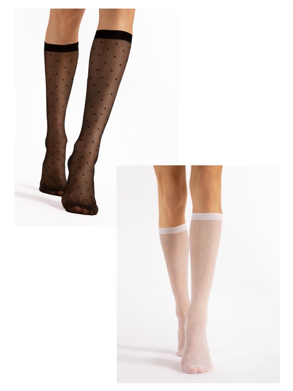 Quebec er skønne nylon knæstrømper fra Fiore. Quebec er tynde, behagelige og gennemsigtige knæstrømper med polka-dot prikker. De er perfekte til de varmere dage. Quebec er silkebløde, matte knæstrømper med et mønster af små, søde prikker. De bringer tankerne tilbage til 50'ernes og 60'ernes vintagestil. Quebec kommer i klassisk sort og hvid. En bred ribkant sikrer god komfort ved brug. Quebec er nylonstrømpe med usynlig tå-forstærkning og produceret af garn fra førende europæiske garnproducenter. Europæisk designet, europæisk produktsikkerhed, europæisk kvalitet, europæisk fremstillet.