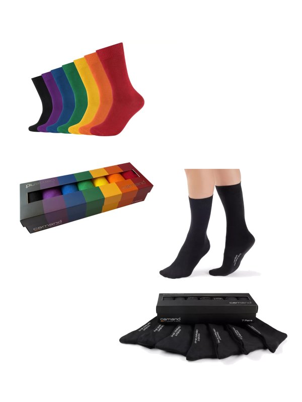 Lækre Camano Comfort Socks bomuldsstrømper produceret i regnbuens skønne farver. Strømpen har en blød komfort-ribkant / Manchet, som bevirker der intet pres eller tryk er omkring anklen. Strømperne føles super bløde og behagelige på foden. Denne Camano strømpe er produceret uden snærende elastik. Håndsyet tå-del. Ingen mærkbar syning. Tå-del og hæl er forstærket. Leveres som 7-PAK i sort og regnbuens farver.