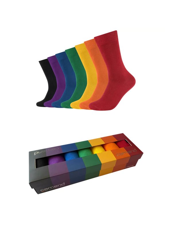 Lækre Camano Comfort Socks bomuldsstrømper produceret i regnbuens skønne farver. Strømpen har en blød komfort-ribkant / Manchet, som bevirker der intet pres eller tryk er omkring anklen. Strømperne føles super bløde og behagelige på foden. Denne Camano strømpe er produceret uden snærende elastik. Håndsyet tå-del. Ingen mærkbar syning. Tå-del og hæl er forstærket. Leveres som 7-PAK i sort og regnbuens farver.
