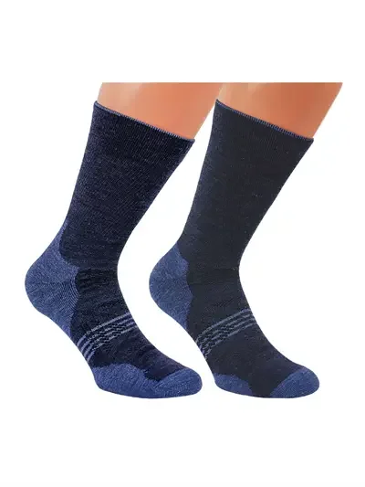 Lækre Merino vandre uldsokker med 35% Merino uld. Lækre robuste sport / outdoor strømper i kraftig kvalitet til både damer og herrer. Disse uldsokker er utrolig behagelig og blød at have på. Strømperne er produceret med frotté sål og har en behagelig komfort-rib. Perfekt til vandreture og udendørs aktiviteter generelt. Denne funktionsstrømpe sikrer du til enhver tid har et sundt og komfortabelt miljø i eksempelvis dine vandresko eller støvler. Modellen er med håndsyet tå-del og ingen mærkbare syninger. Leveres som 2-PAK i Jeans