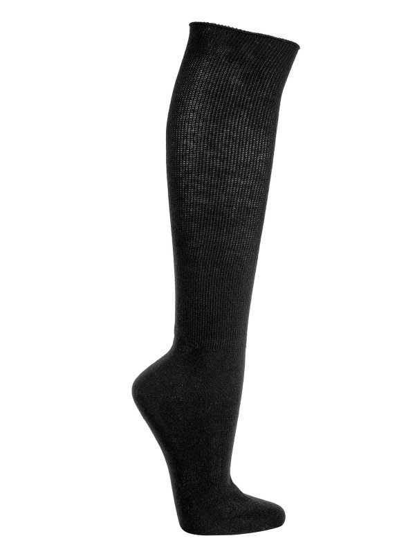 Lækre knæstrømper i specialstrik med ekstra bred læg. Velegnet til personer med problemfødder som eks. hævede fødder. Den ekstra brede piqué komfort-rib indeholder ikke noget gummielastik og giver optimal støtte uden at stramme. Produceret med bløde håndknyttede søm for at beskytte det følsomme tå-område. 2-pak i sort