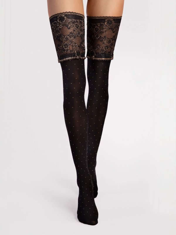 - Selvsiddende strømpe med flotte guldprikker i hele benets længde.
