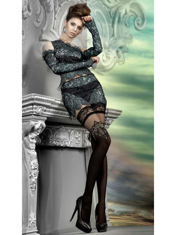 Eksklusive og flotte selvsiddende strømper fra Ballerina. Denne selvsiddende strømpe har en flot bred blonde og er prydet med et smuk guldmønster på låret. Model 221 fra Ballerina er opaque (uigennemsigtig) op til midt på låret, hvorefter den går over i en gennemsigtig hudtone for at afslutte i en flot bred blonde. En feminin blondetop fuldender silhuetten med tidløs romantik, og Lycra®-blandingen sikrer en fleksibel, siddende pasform. Du får dobbelt silikonebånd for optimalt hold på låret. Disse selvsiddende strømper er udført med usynlig tåforstærkning og denne smukke model fra Ballerina kan du eksempelvis bruge til at forkæle en du elsker, som helt sikkert vil værdsætte dig i denne smukke model i klassisk sort med et flot mønster i guld. Ballerina er garant for top kvalitet og de benytter udelukkende original Lycra i deres produkter.