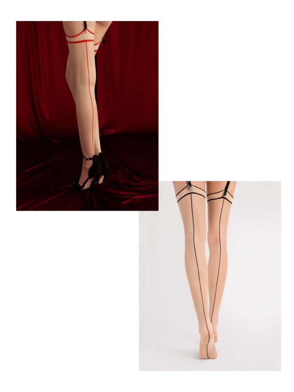 Madame bringer straks tankerne hen på Paris i 1950,erne. Her får du en smuk og elegant stocking til hofteholder med klassisk bagsøm. Bagsømmet får optisk dine ben til at fremstå smallere. Denne stocking er udført med et pin-up topmønster i samme farve som bagsømmet. Madame er udført med usynlig tåforstærkning for elegance og fremstår i en flot mat finish.