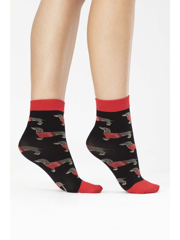 Med Xmas Pal fra Fiore får du nylonstrømper med sort bund og søde hunde iklædt rødt. Disse julesokker bjæffer som det bør sig her op til juletid. Ribben kommer i en levende rød farve og disse nylonstrømper / julestrømper vil med sikkerhed pifte dit outfit op i denne søde juletid. Pak dine fødder ind, så de matcher julepynt og sjov under juletræet!