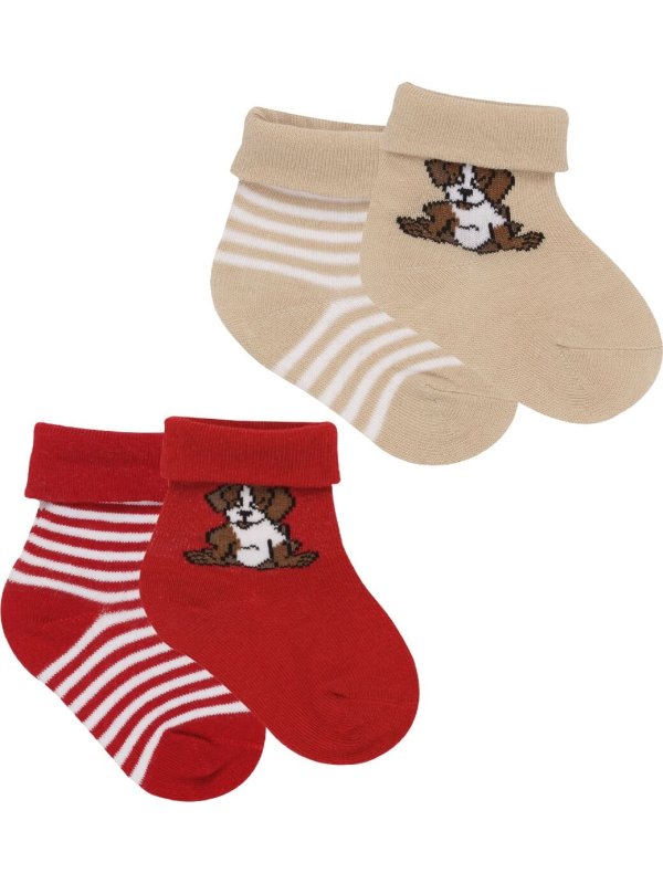 Lækre babystrømper i bomuld med ankelkrave og komfort-rib. Håndsyet tå-del. Tå-del og hæl er forstærket. Helt flade syninger hvilket sikrer optimal komfort.Strømperne er prydet med striber og en sød hund på anklen. Fås i 2-PAK.