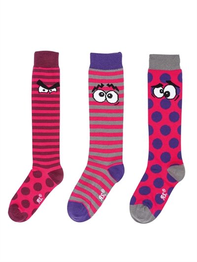 Lækker og sjov knæstrømpe til børn med ansigter. Strømpen er udført med komfort-rib hvilker gør at strømpen holder hele dagen uden at genere. Håndsyet tå-del. Både hæl og tådel er forstærket. Ingen mærkbare syninger. Knæstrømper leveres i en 3-PAK i enten Bordeaux/Grå/Pink eller Navy/Sølv/Blå