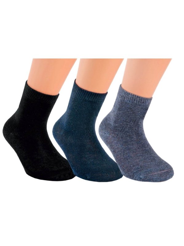 Her serveres klassiske farver. Disse lækre børnestrømper fås i en 3-PAK indeholdende Sort / Marine / Jeans. Strømperne er udført med komfort-rib og er forstærket i hæl- og tå-del.