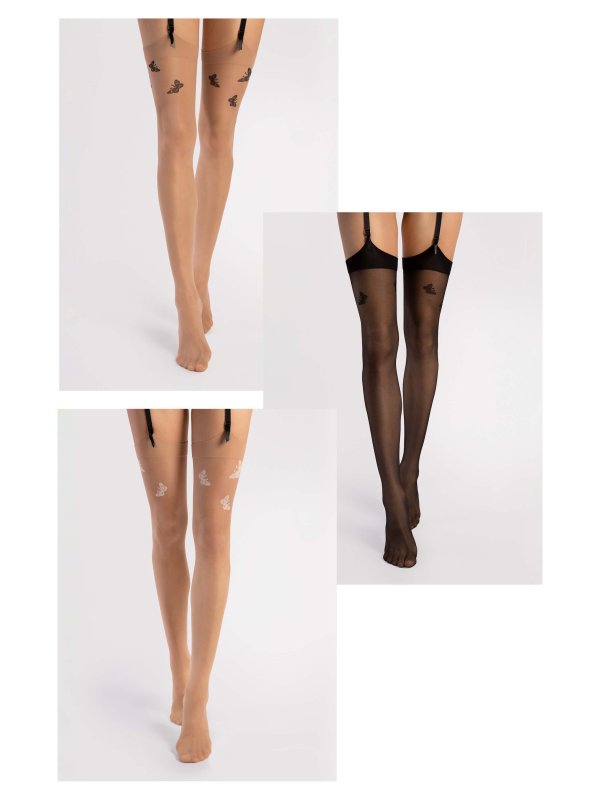 Farfalle er en flot stocking med sommerfugle der bevæger sig ubesværet rund på låret. Farfalle kommer i 3 kombinationer med sommerfugle i sort og ecry på en nude og sort baggrundsfarve. Den resterende del af strømpen er designet i klassisk nedtonet stil således at sommerfuglene kommer til sin fulde ret. Farfalle supplerer din feminine glød og løfter stemningen til nye højder med sommerfugle der flyver let og ubesværet. Sommerfuglene kan løftes endnu højere op med at par passende høje hæle der også er en manifestation af din feminine kraft. Stockings Farfalle er udført med usynlig tåforstærkning for elegance. Denne Stocking er produceret af kvalitetsgarn og fås i 3 kombinationer.