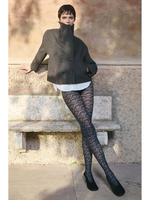 Åbnede strømpebukser i mikrofiber med geometrisk blondemønster. Komfortabel linning, flad firnålssøm, strøget